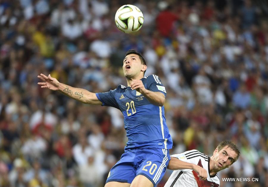 Argentina's Sergio Aguero (L) heads the ball during the final match between Germany and Argentina of 2014 FIFA World Cup at the Estadio do Maracana Stadium in Rio de Janeiro, Brazil, on July 13, 2014. (Xinhua/Yang Lei)