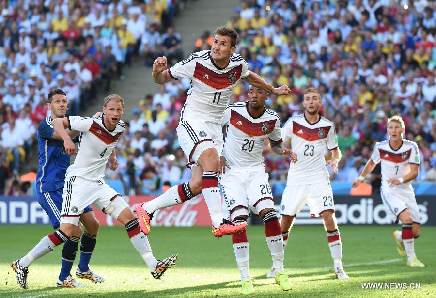 Germany's Miroslav Klose (up) strives for a header during the final match between Germany and Argentina of 2014 FIFA World Cup at the Estadio do Maracana Stadium in Rio de Janeiro, Brazil, on July 13, 2014. (Xinhua/Liu Dawei)