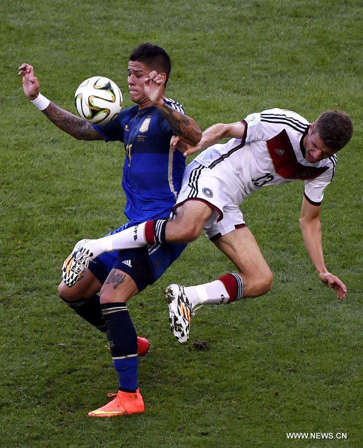 Germany's Thomas Muller vies with Argentina's Marcos Rojo during the final match between Germany and Argentina of 2014 FIFA World Cup at the Estadio do Maracana Stadium in Rio de Janeiro, Brazil, on July 13, 2014. (Xinhua/Lui Siu Wai)