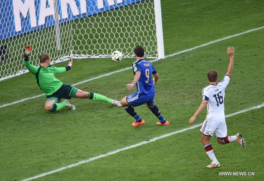Argentina's Gonzalo Higuain (C) scores a goal which is later nullified for his offside foul during the final match between Germany and Argentina of 2014 FIFA World Cup at the Estadio do Maracana Stadium in Rio de Janeiro, Brazil, on July 13, 2014. (Xinhua/Li Ga)
