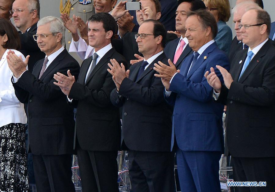 French President Francois Hollande(3rd R) and other leaders attend the annual Bastille Day military parade in Paris on July 14, 2014. France has issued an unprecedented invitation to more than 70 countries involved in World War I to take part in its annual Bastille Day military parade. (Xinhua/Etienne Laurent)
