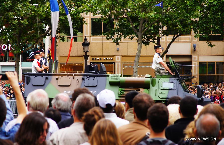 People watch the annual Bastille Day military parade on the Champs Elysees Avenue in Paris, France, on July 14, 2014. France celebrated National Day with a grand parade, which was participated by troops from 80 nations. (Xinhua/Li Genxing)