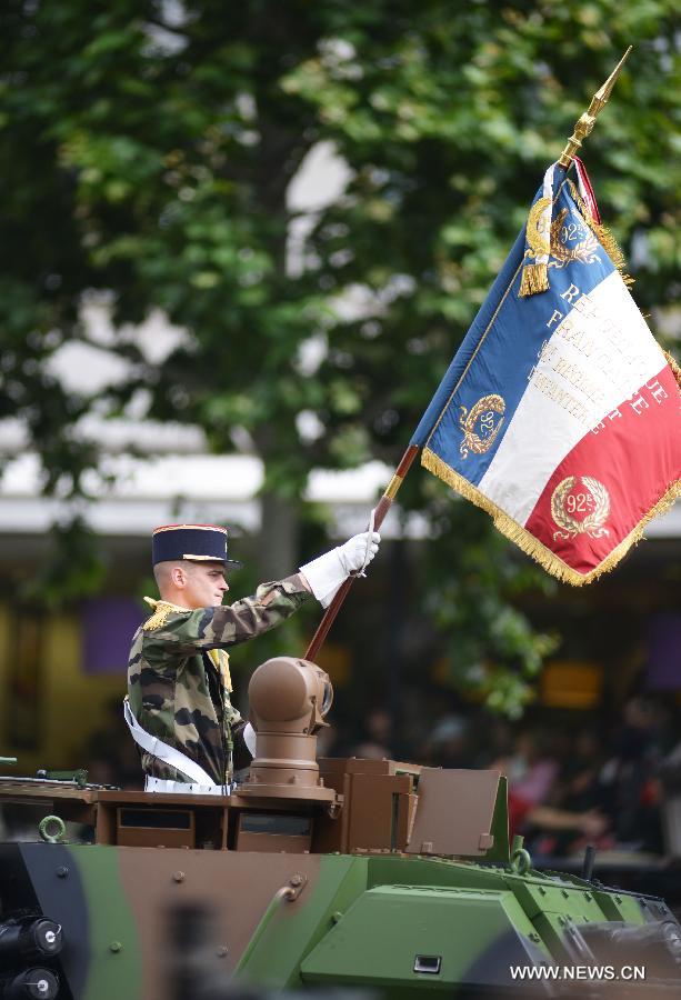 A soldier participates in the annual Bastille Day military parade on the Champs Elysees Avenue in Paris, France, on July 14, 2014. France celebrated National Day with a grand parade, which was participated by troops from 80 nations. (Xinhua/Li Genxing)