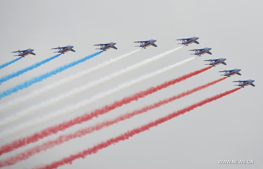 La Patrouille de France of French Air Force, releasing trails of blue, white and red smoke, the colors of the French national flag, flies in formation over Paris during the annual Bastille Day military parade, in France, on July 14, 2014. France celebrated National Day with a grand parade, which was participated by troops from 80 nations. (Xinhua/Li Genxing)