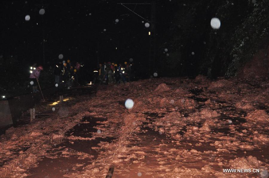 Workers clear mud off the railway in Xinzhan Township, Tongzi County, southwest China's Guizhou Province, July 15, 2014. A rain-triggered landslide on Monday affected train services between Guizhou and Sichuan provinces. Fourteen trains were canceled after the landslide hit the railway section between the stations of Taibai and Mengdu in the city of Zunyi. (Xinhua/Jiang Longrong)