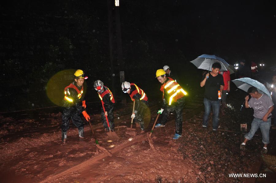 Workers clear mud off the railway in Xinzhan Township, Tongzi County, southwest China's Guizhou Province, July 15, 2014. A rain-triggered landslide on Monday affected train services between Guizhou and Sichuan provinces. Fourteen trains were canceled after the landslide hit the railway section between the stations of Taibai and Mengdu in the city of Zunyi. (Xinhua/Jiang Longrong)