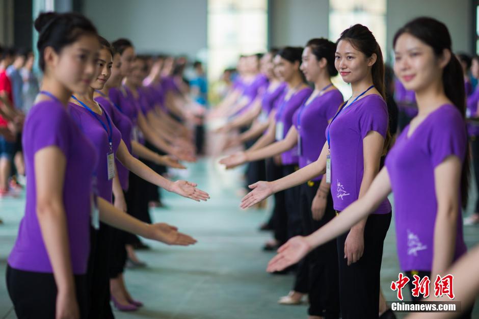 Volunteers for the 2014 Nanjing Youth Olympic Games receive training on July 13, 2014. On July 13, 491 ceremony volunteers for the 2014 Nanjing Youth Olympic Games make public appearance. All of them are from 18 colleges including Southeast University, Nanjing Agriculture University and Nanjing Sport Institute. (CNS/Yang Bo)