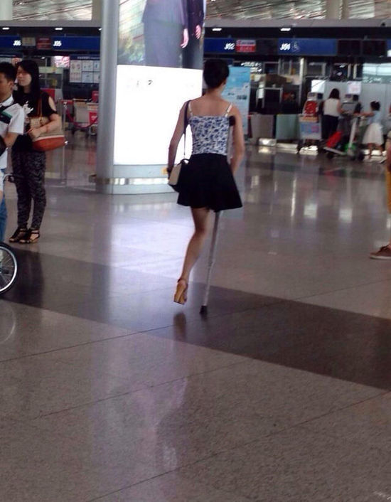 On July 8, 2014, a netizen put the photos of a one-legged woman wearing high heel at the Beijing airport on the Internet, with comment "What a beautiful girl!"