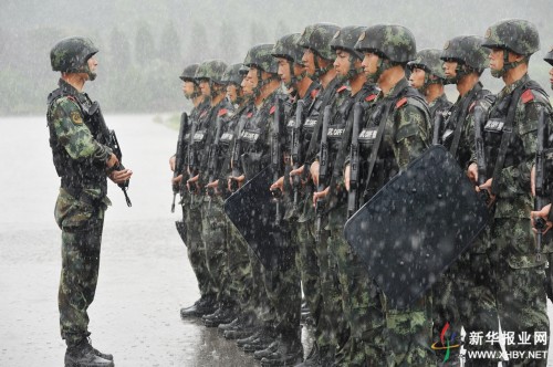 On July 12, 2014, soldiers of the People's Armed Police Force receive training in the rain in Nanjing, east China's Jiangsu Province. The training aims to temper their willpower and help them make good preparations for the security work of the Nanjing 2014 Youth Olympic Games. (Photo/XHBY.NET)