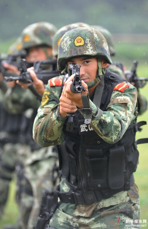 On July 12, 2014, soldiers of the People's Armed Police Force receive training in the rain in Nanjing, east China's Jiangsu Province. The training aims to temper their willpower and help them make good preparations for the security work of the Nanjing 2014 Youth Olympic Games. (Photo/XHBY.NET)
