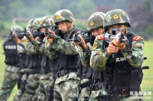 On July 12, 2014, soldiers of the People's Armed Police Force receive training in the rain in Nanjing, east China's Jiangsu Province. The training aims to temper their willpower and help them make good preparations for the security work of the Nanjing 2014 Youth Olympic Games. (Photo/XHBY.NET)