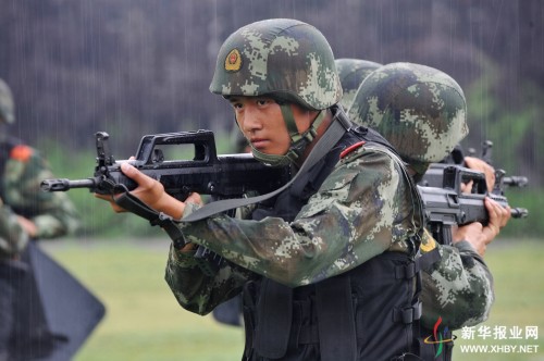 On July 12, 2014, soldiers of the People's Armed Police Force receive training in the rain in Nanjing, east China's Jiangsu Province. The training aims to temper their willpower and help them make good preparations for the security work of the Nanjing 2014 Youth Olympic Games. (Photo/XHBY.NET)