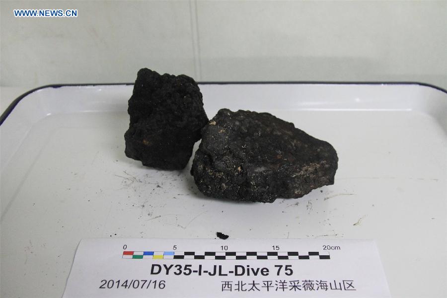 | Photo taken on July 16, 2014 shows Cobalt-rich crusts collected by Jiaolong, China's first manned deep-sea submersible, in the northwest Pacific Ocean, July 16, 2014. The submersible has launched a voyage in the northwest Pacific Ocean, during which it will research cobalt-rich crusts and life forms inhabiting the bottom of the sea. (Xinhua/Luo Sha) |