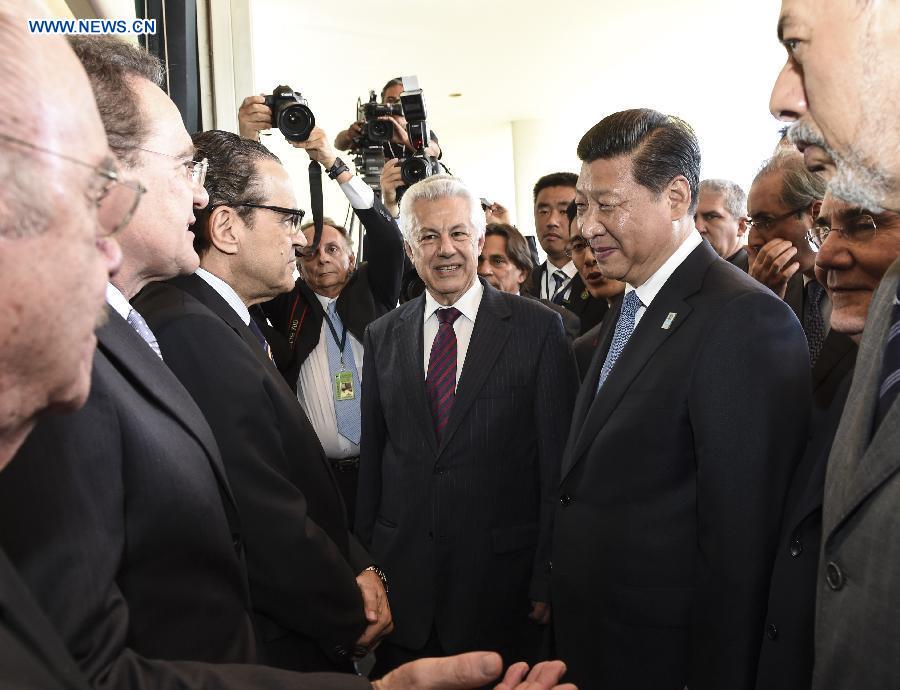Chinese President Xi Jinping is welcomed as his meets with Brazilian Senate President Renan Calheiros and President of the Chamber of Deputies Henrique Eduardo Alves, in Brasilia, Brazil, July 16, 2014. (Xinhua/Li Xueren)