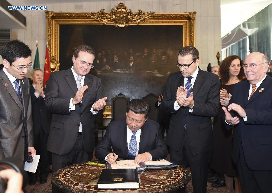 Chinese President Xi Jinping (C) signs a guest book during his meeting with Brazilian Senate President Renan Calheiros (2nd L, front) and President of the Chamber of Deputies Henrique Eduardo Alves (2nd R, front), in Brasilia, Brazil, July 16, 2014. (Xinhua/Li Xueren)