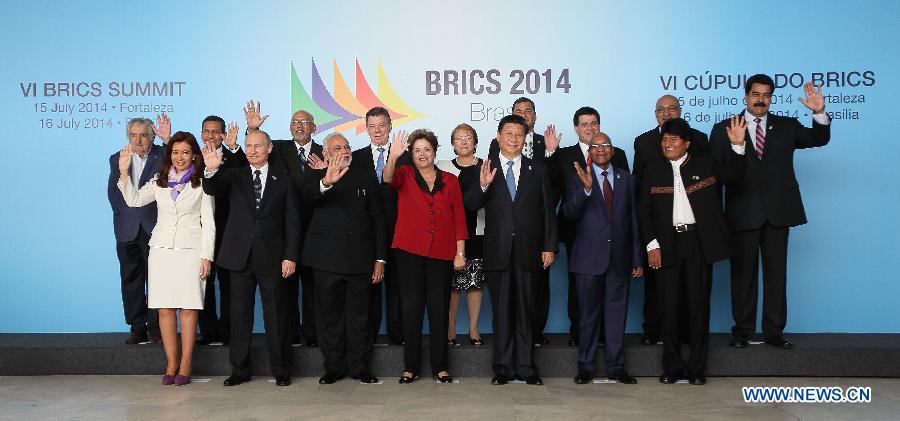 | Chinese President Xi Jinping (3rd R, front) poses for a group photo with participants of a dialogue between BRICS countries' leaders and presidents from 11 South American nations, in Brasilia, Brazil, July 16, 2014. (Xinhua/Lan Hongguang) |