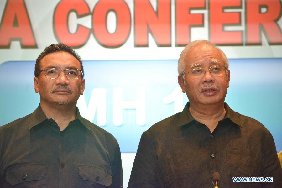 Malaysian Prime Minister Najib Razak (R) and Malaysian Defense Minister Hishamuddin Tun Hussein attend a press conference at a hotel at the Kuala Lumpur International Airport, in Kuala Lumpur, Malaysia, July 18, 2014. Malaysian Prime Minister Najib Razak said here Friday at a press conference that the MH17's flight route was declared safe by the International Civil Aviation Organization (ICAO), adding that the International Air Transportation Association had stated that the airspace the aircraft was traversing was not subject to restrictions. (Xinhua/Chong Voon Chung)
