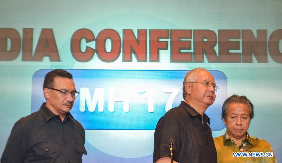 | Malaysian Prime Minister Najib Razak (C) attends a press conference at a hotel at the Kuala Lumpur International Airport, in Kuala Lumpur, Malaysia, July 18, 2014. Malaysian Prime Minister Najib Razak said here Friday at a press conference that the MH17's flight route was declared safe by the International Civil Aviation Organization (ICAO), adding that the International Air Transportation Association had stated that the airspace the aircraft was traversing was not subject to restrictions. (Xinhua/Chong Voon Chung) |