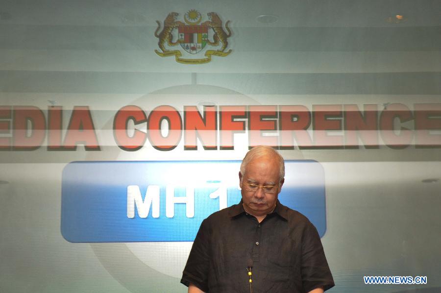 Malaysian Prime Minister Najib Razak speaks during a press conference at a hotel at the Kuala Lumpur International Airport, in Kuala Lumpur, Malaysia, July 18, 2014. Malaysian Prime Minister Najib Razak said here Friday at a press conference that the MH17's flight route was declared safe by the International Civil Aviation Organization (ICAO), adding that the International Air Transportation Association had stated that the airspace the aircraft was traversing was not subject to restrictions. (Xinhua/Chong Voon Chung)