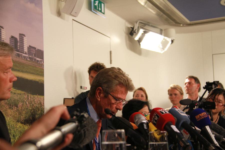 European Director of Malaysia Airlines Huib Gorter (2nd L) speaks at a press conference at the Schiphol Airport in Amsterdam, the Netherlands, on July 17, 2014. Dutch Prime Minister Mark Rutte said on Thursday that dozens of Dutch citizens might have been killed in the Malaysian passenger crash over the eastern part of Ukraine. (Xinhua/Pan Zhi)