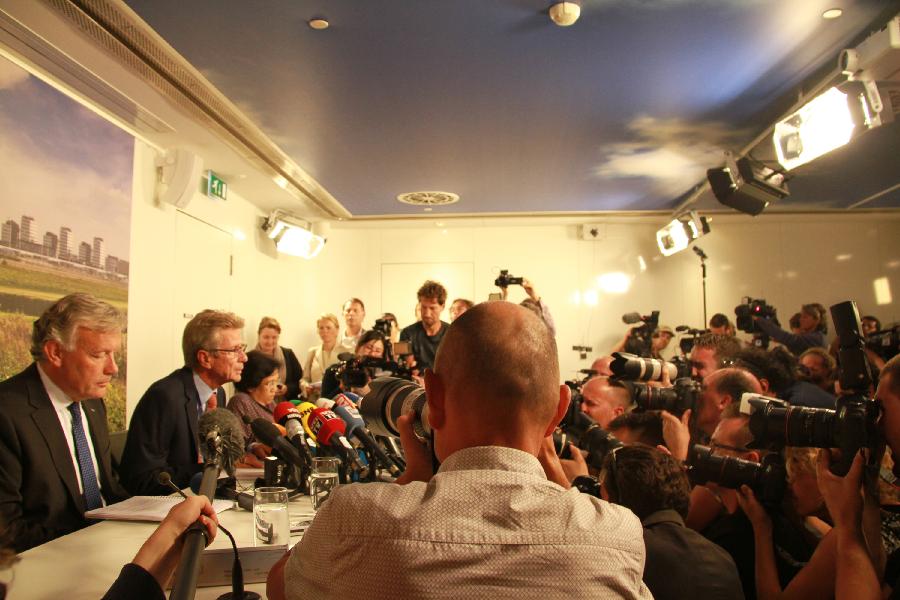 European Director of Malaysia Airlines Huib Gorter (2nd L) speaks at a press conference at the Schiphol Airport in Amsterdam, the Netherlands, on July 17, 2014. Dutch Prime Minister Mark Rutte said on Thursday that dozens of Dutch citizens might have been killed in the Malaysian passenger crash over the eastern part of Ukraine. (Xinhua/Pan Zhi)