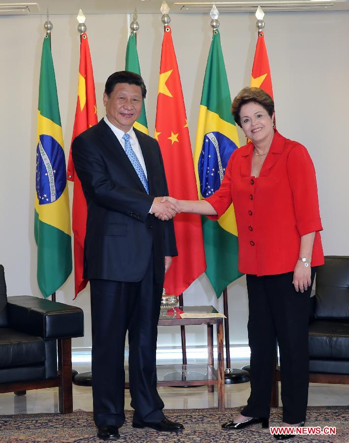Chinese President Xi Jinping (L) and his Brazilian counterpart Dilma Rousseff shake hands during their meeting in Brasilia, Brazil, July 17, 2014. (Xinhua/Lan Hongguang)