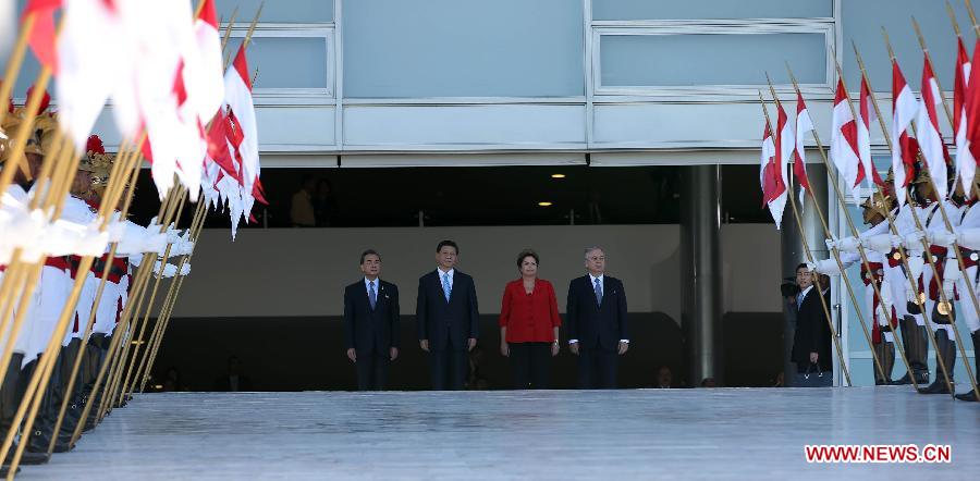 Chinese President Xi Jinping (2nd L) attends a welcome ceremony held for him by his Brazilian counterpart Dilma Rousseff (2nd R) in Brasilia, Brazil, July 17, 2014. (Xinhua/Lan Hongguang)
