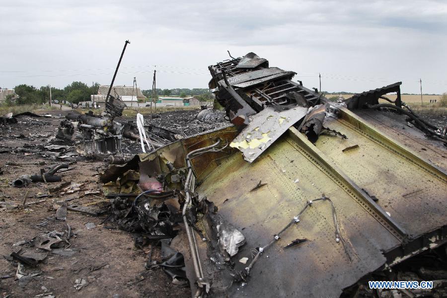 | Photo taken on July 18, 2014 shows the debris at the crash site of MH17 of Malaysian Airlines near the city of Shakhtarsk in Ukraine's Donetsk region. Malaysian Transport Minister Liow Tiong Lai said Friday that according to the International Civil Aviation Organization's Annex 13, the Ukrainian government should institute an investigation into the circumstances of the deadly MH17 incident, and be responsible for the conduct of the investigation. (Xinhua/Alexander Ermochenko) |