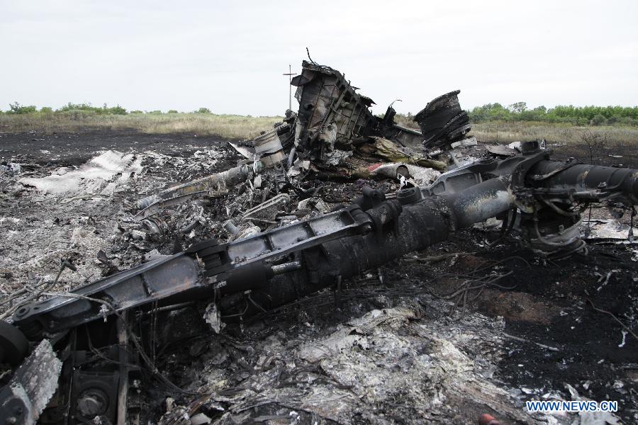 Photo taken on July 18, 2014 shows the debris of MH17 of Malaysian Airlines near the city of Shakhtarsk in Ukraine's Donetsk region. Malaysian Transport Minister Liow Tiong Lai said Friday that according to the International Civil Aviation Organization's Annex 13, the Ukrainian government should institute an investigation into the circumstances of the deadly MH17 incident, and be responsible for the conduct of the investigation. (Xinhua/Alexander Ermochenko)