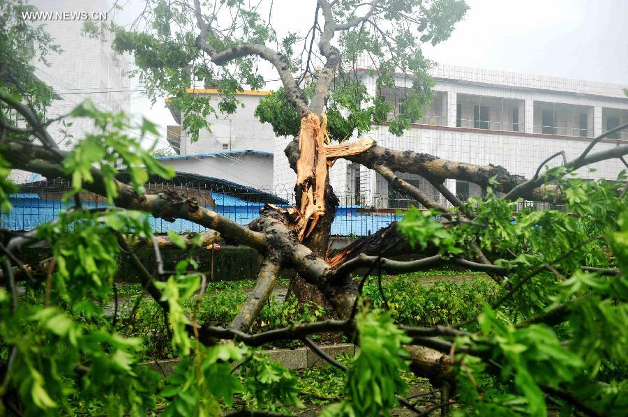 | Photo taken on July 19, 2014 shows a tree uprooted due to the super typhoon Rammasun in Qinzhou City of Guangxi Zhuang Autonomous Region. Typhoon Rammasun, the ninth in this year and the strongest in decades, made its latest landfall in southwest China's Guangxi at 7:10 a.m. on Saturday and packed gales of up to 48 meters per second, the National Meteorological Center (NMC) said in a statement. (Xinhua/Zhang Ailin) |