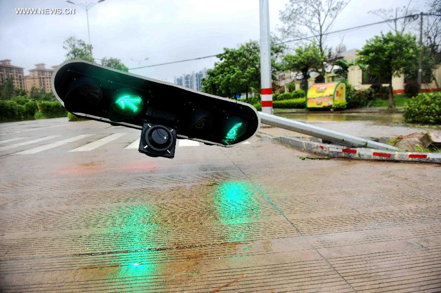 Photo taken on July 19, 2014 shows a traffic light toppled due to the super typhoon Rammasun in Qinzhou City of Guangxi Zhuang Autonomous Region. Typhoon Rammasun, the ninth in this year and the strongest in decades, made its latest landfall in southwest China's Guangxi at 7:10 a.m. on Saturday and packed gales of up to 48 meters per second, the National Meteorological Center (NMC) said in a statement. (Xinhua/Zhang Ailin)