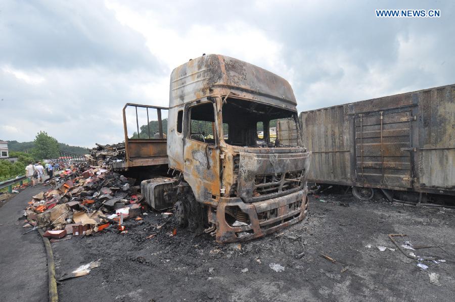 Photo taken on July 19, 2014 shows the scene of a traffic accident on a section of the Hukun (Shanghai to Kunming) Expressway in central China's Hunan Province. At least 38 people are confirmed dead and another five injured after a vehicle crash triggered fire and explosion on the highway early Saturday morning, police said. (Xinhua/Long Hongtao)