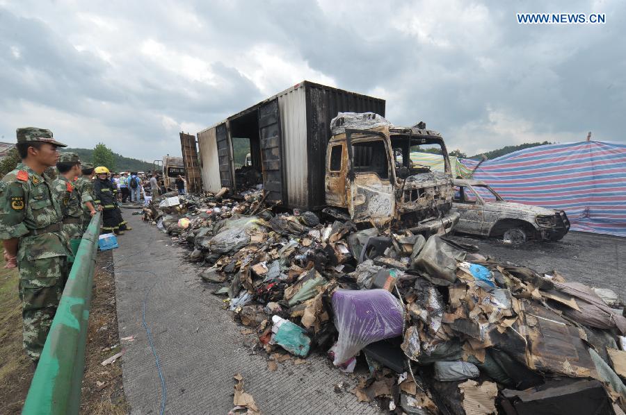 Photo taken on July 19, 2014 shows the scene of a traffic accident on a section of the Hukun (Shanghai to Kunming) Expressway in central China's Hunan Province. At least 38 people are confirmed dead and another five injured after a vehicle crash triggered fire and explosion on the highway early Saturday morning, police said. (Xinhua/Long Hongtao)