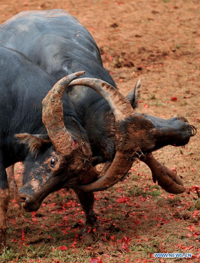 Chinese Bullfights are held during the Torch Festival of Yi ethnic group in Yi Autonomous County of Shilin, southwest China's Yunnan Province, on July 19,2014 (Source: xinhuanet.com)