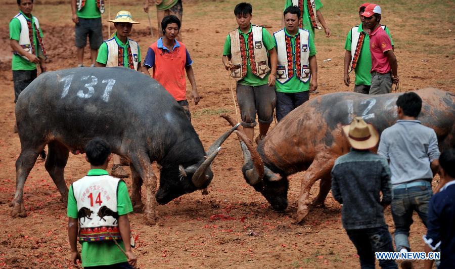 Chinese Bullfights are held during the Torch Festival of Yi ethnic group in Yi Autonomous County of Shilin, southwest China's Yunnan Province, on July 19,2014 (Source: xinhuanet.com)
