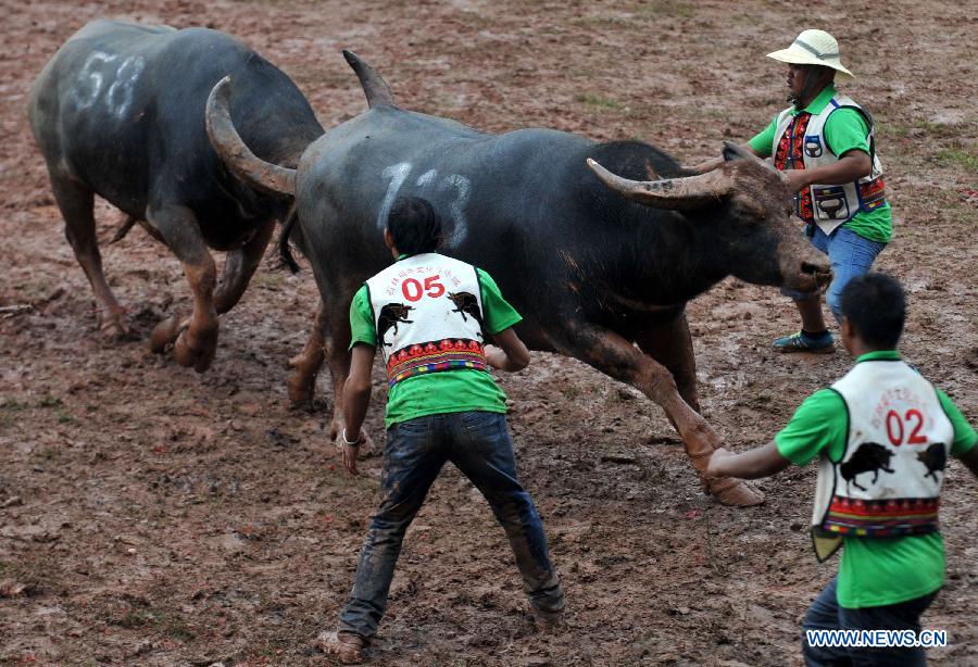 Chinese Bullfights are held during the Torch Festival of Yi ethnic group in Yi Autonomous County of Shilin, southwest China's Yunnan Province, on July 19,2014 (Source: xinhuanet.com)