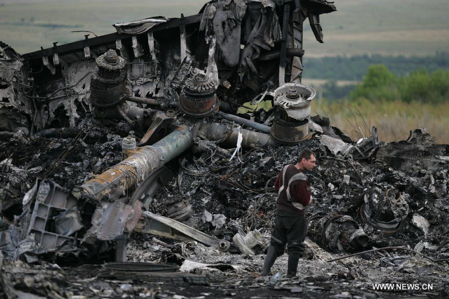 Photo taken on July 20, 2014 shows the debris at the crash site of MH17 of Malaysian Airlines in Ukraine's Donetsk region. Some 198 bodies recovered from the Malaysian airliner crash site have been loaded onto refrigerated train carriages bound for a city in eastern Ukraine, the RIA Novosti news agency reported on Sunday. (Xinhua/Alexander Ermochenko)