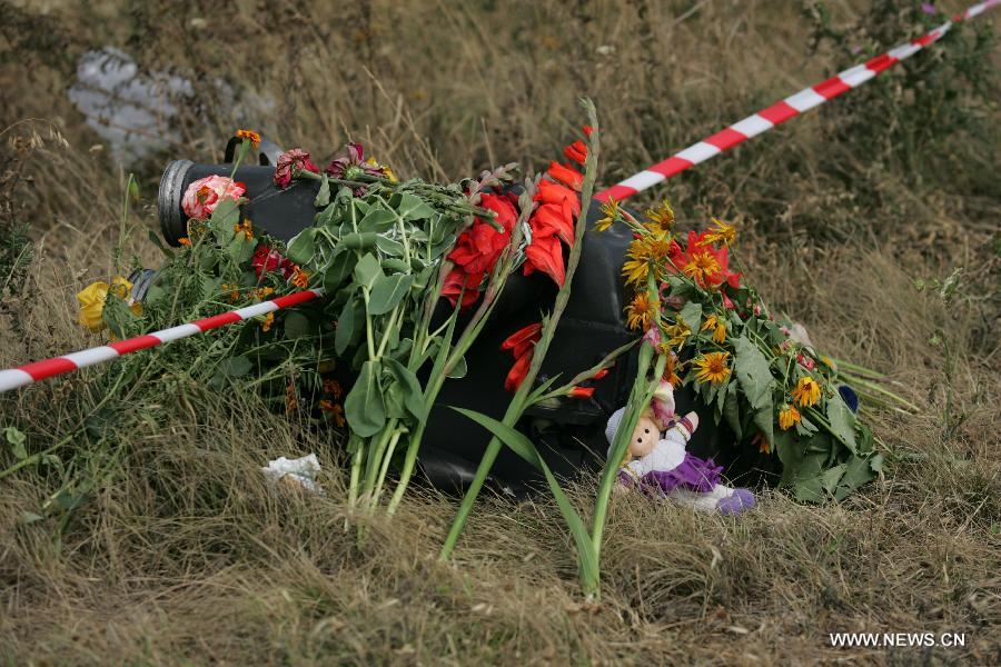 Flowers are seen placed at the crash site of MH17 of Malaysian Airlines in Ukraine's Donetsk region, July 20, 2014. Some 198 bodies recovered from the Malaysian airliner crash site have been loaded onto refrigerated train carriages bound for a city in eastern Ukraine, the RIA Novosti news agency reported on Sunday. (Xinhua/Alexander Ermochenko)