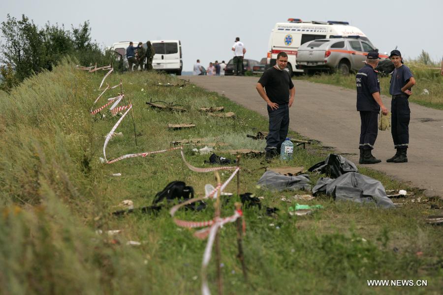 | Photo taken on July 20, 2014 shows the debris at the crash site of MH17 of Malaysian Airlines in Ukraine's Donetsk region. Some 198 bodies recovered from the Malaysian airliner crash site have been loaded onto refrigerated train carriages bound for a city in eastern Ukraine, the RIA Novosti news agency reported on Sunday. (Xinhua/Alexander Ermochenko) |