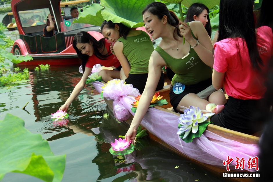 Ambassadors of Zhujiang city boat on a lake and put the floating Lotus lanterns on the water. 20 beautiful ambassadors of Zhujiang city attended the activities held in Lotus World in Foshan, south China's Guangdong province on July 20, 2014. (Photo/CNS)