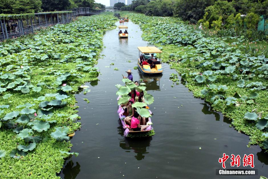 Ambassadors of Zhujiang city boat on a lake and put the floating Lotus lanterns on the water. 20 beautiful ambassadors of Zhujiang city attended the activities held in Lotus World in Foshan, south China's Guangdong province on July 20, 2014. (Photo/CNS)