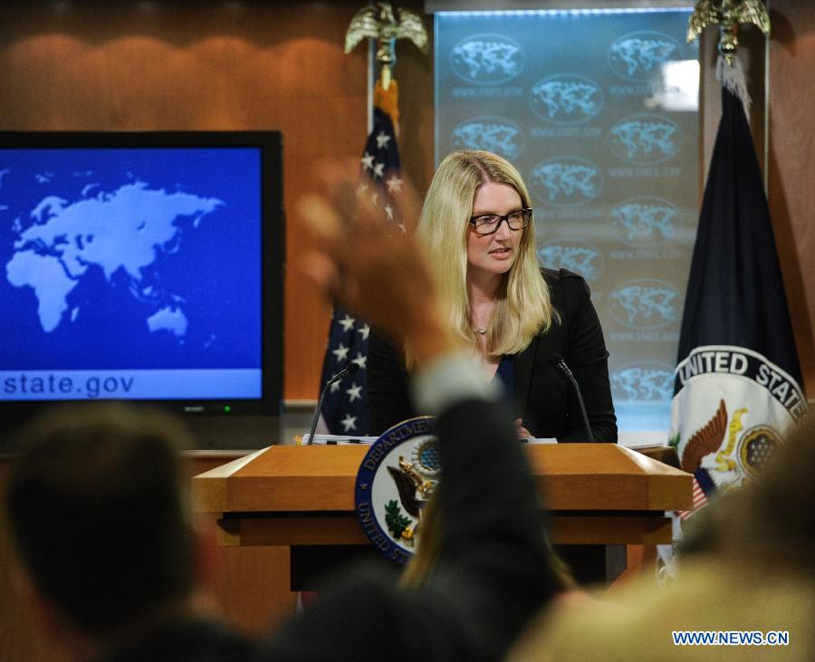 U.S. State Department spokeswoman Marie Harf speaks during daily press briefing in Washington D.C., capital of the United States, July 21, 2014. U.S. President Barack Obama on Monday called for a full, unimpeded and transparent investigation into the crash of Malaysian airliner MH17 in Ukraine. (Xinhua/Bao Dandan)