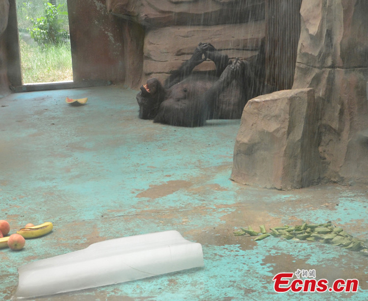Animals are offered ice, shower, and watermelons to beat summer heat at Zhengzhou Zoo in Zhengzhou of Henan province on July 21, 2014. On Monday the city witnessed the highest temperature of nearly 40 degrees Celsius. [Photo/Liu Linzi]