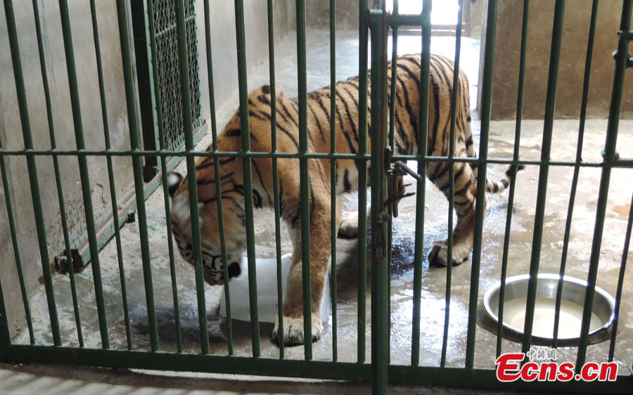 Animals are offered ice, shower, and watermelons to beat summer heat at Zhengzhou Zoo in Zhengzhou of Henan province on July 21, 2014. On Monday the city witnessed the highest temperature of nearly 40 degrees Celsius. [Photo/Liu Linzi]