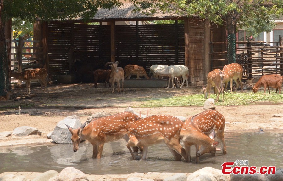 | Animals are offered ice, shower, and watermelons to beat summer heat at Zhengzhou Zoo in Zhengzhou of Henan province on July 21, 2014. On Monday the city witnessed the highest temperature of nearly 40 degrees Celsius. [Photo/Liu Linzi] |