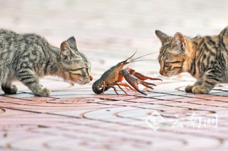 A fight between a lobster and three cats recently took place on the bank of Daguan River in Kunming, southwest China’s Yunnan province. A lobster that had wandered ashore came under attack of a cat, which, failing to win on its own, hailed its buddies to join the war. But after much power wrestling, the besieged lobster managed to escape the claws and jaws of the cats largely intact. (Photo/Yunnan.cn)