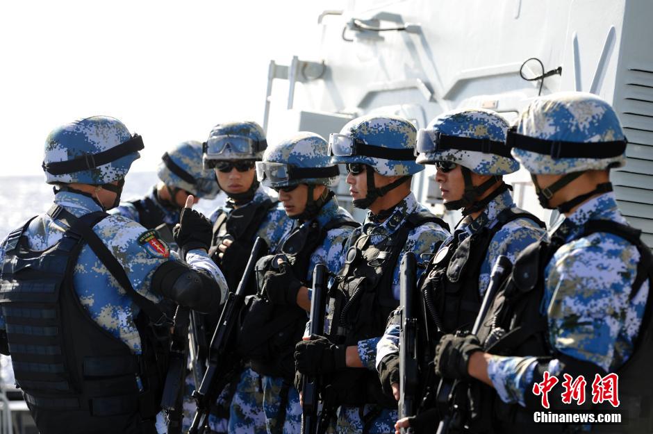 Chinese navy commandos stand on missile destroyer Haikou and prepare to join the maritime assault exercise of the Rim of the Pacific (RIMPAC) multinational naval drill on July 21, 2014. RIMPAC, which started in 1971, is the world's largest multinational maritime military exercise. A total of 22 nations participate in this year's naval drill. (CNS/Mao Jianjun)