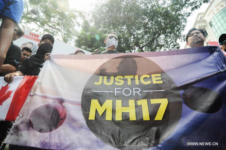 Protesters shout slogans demanding justice for the victims of Malaysia Airlines Flight MH17 at a rally held by Malaysia's ruling United Malays National Organization (UMNO)'s youth wing outside the Russian embassy and United Nations office in Kuala Lumpur July 22, 2014. Rallies are held by UMNO's youth wing outside Russian and Ukrainian embassies in Kuala Lumpur, demanding a justice investigation of the crash of Malaysian Airlines Flight MH17. (Xinhua/Chong Voon Chung)