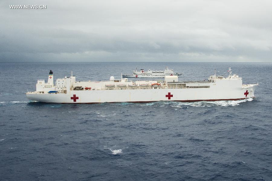 China's hospital ship Peace Ark (Back) and USNS Mercy hospital ship are seen during the Rim of the Pacific (RIMPAC) multinational naval exercises on June 22, 2014. (Xinhua/Qin Haishi)