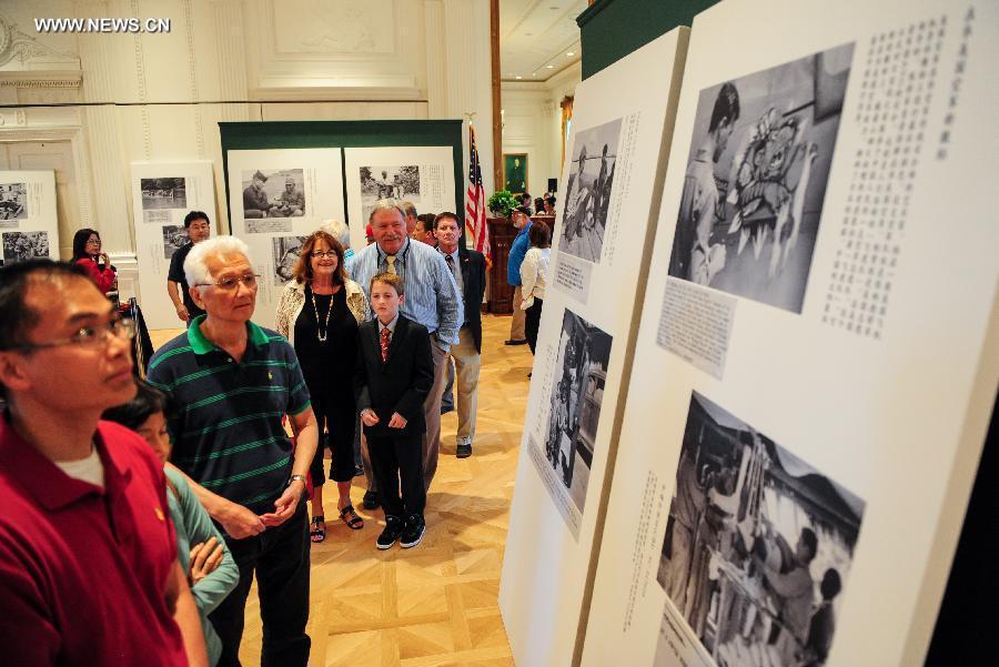 People visit the photo exhibition "Salute to Friendship - Images Narrate China-U.S. Collaboration During World War II" at the Nixon Library in Yorba Linda City of California, the United States, July 23, 2014. The photos were taken by soldiers of the U.S. Army Signal Corps in China during WWII. (Xinhua/Zhang Chaoqun)